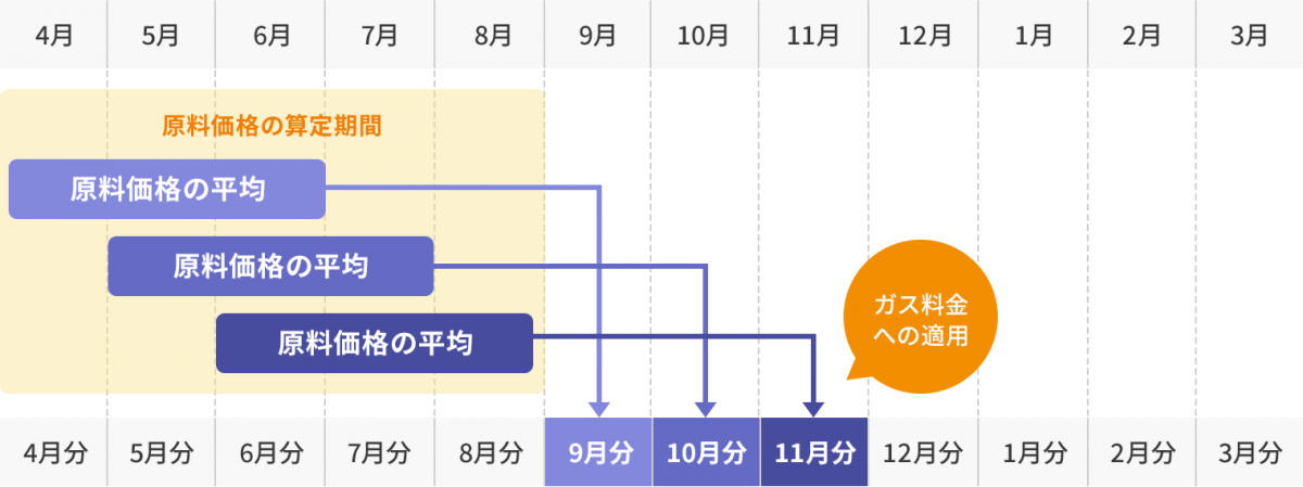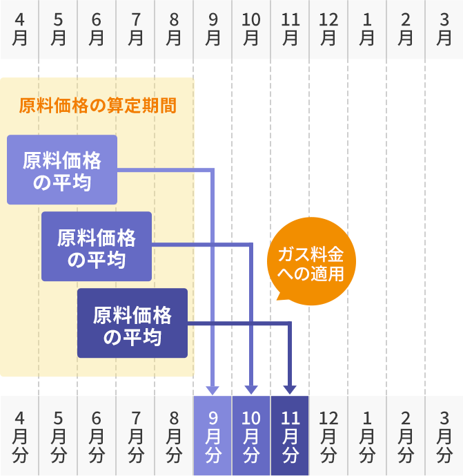 原料費調整制度とは、都市ガスの原料であるLNG(液化天然ガス)やLPG(液化石油ガス)の価格変動に応じて、毎月ガス料金を調整する制度です。原料費調整額を毎月のガス料金に反映しています。
