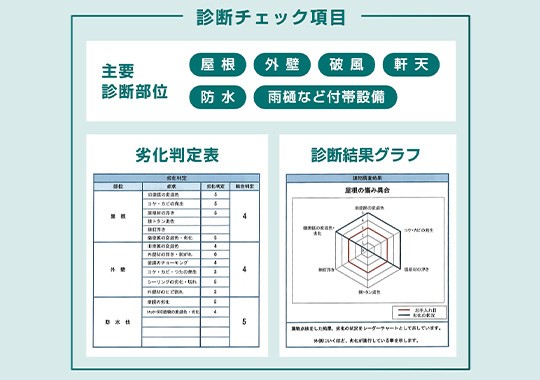 診断結果を各部ごとに点検写真とともに「診断書」にしてご提出します。どなたにも解る「解り易い診断報告書」をもとに、劣化状況に合った塗材種類や塗装方法を見積書と合わせて提案します。