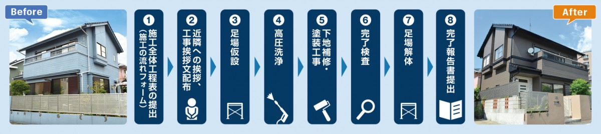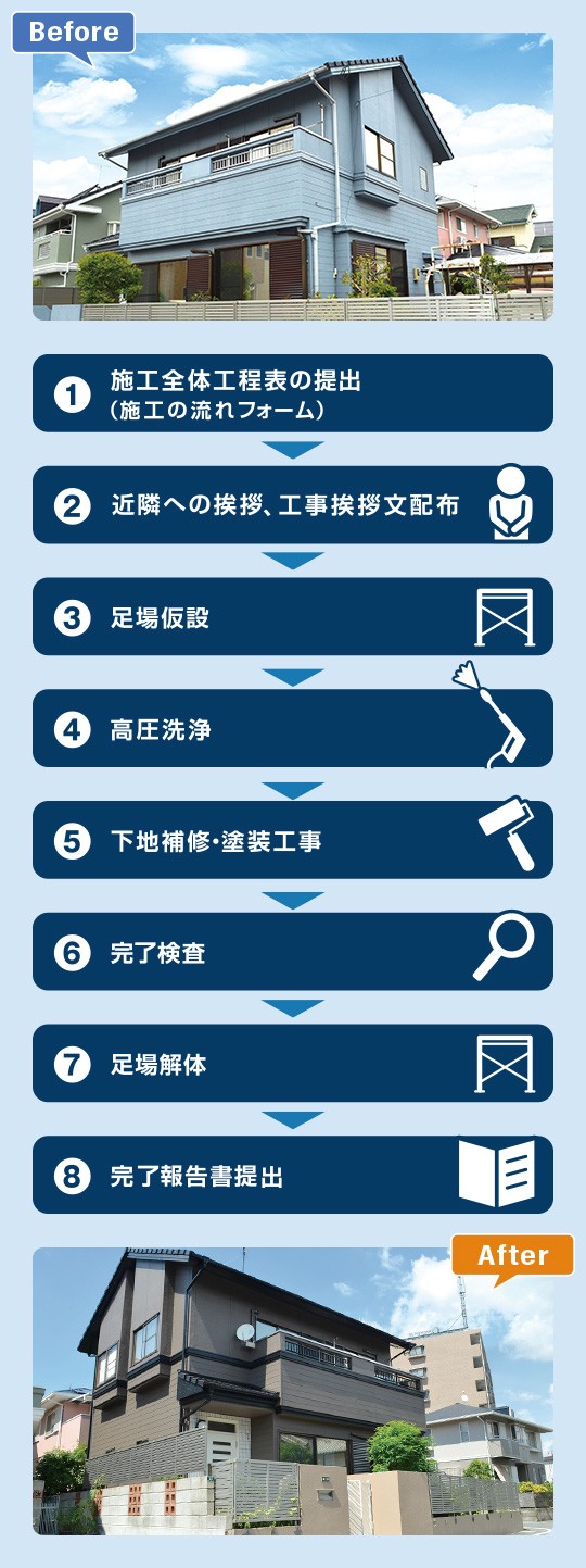 外壁塗装の施工スケジュール表提出後、施工に先立ちご近所へのご挨拶や工事挨拶文書を配布。近隣の皆様にもご迷惑を掛けない様に配慮して施工に取り掛かります。